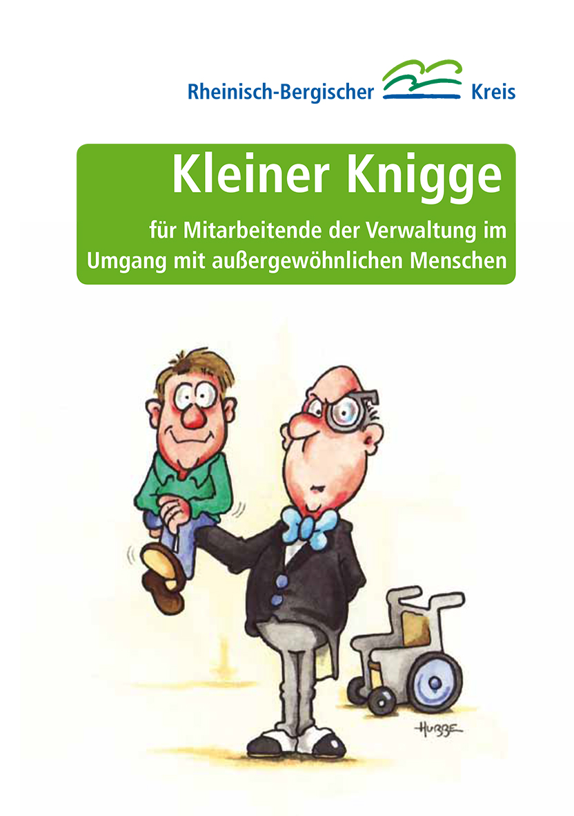 Meine auflagenstärkste Schrift ist tatsächlich ein kleiner Verhaltensratgeber. Dirk Jäckel (von der Geschäftsstelle Inklusion des Rheinisch-Bergischen Kreises) kam auf die Idee: „Ich glaube, die Mitarbeitenden der öffentlichen Verwaltungen wollen Inklusion, sind aber manchmal verunsichert. Kannst du uns helfen und einen kleinen Knigge schreiben?“ Herausgekommen ist ein humorvoller, pragmatischer und anschaulicher kleiner Knigge.